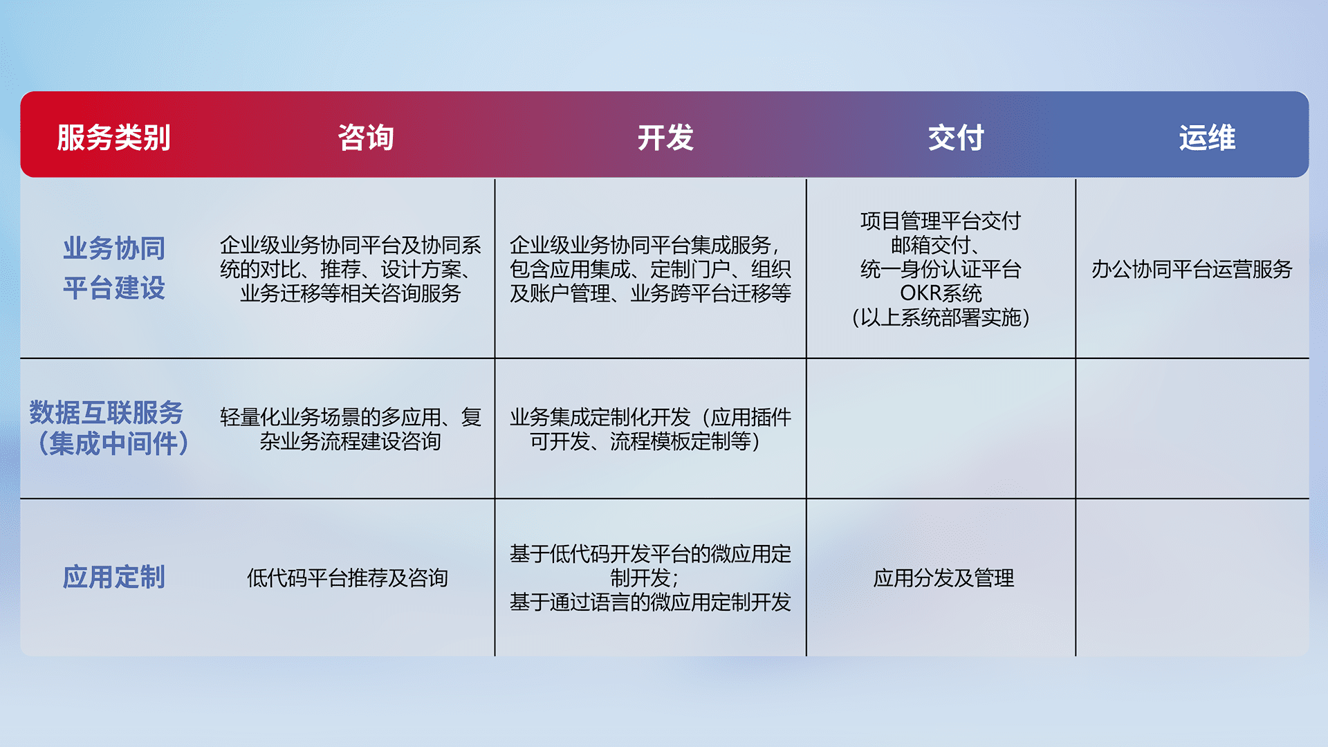 针对钉钉、、企微、、IDaas等平台级产品提供产品的规划、、方案、、、交付、、、、定制化开发等服务,,实现如统一协同办公、、智能客户服务、、混合会议管理、、、、智能数据查询、、、等业务场景,,,,实现数字化转型。。。。